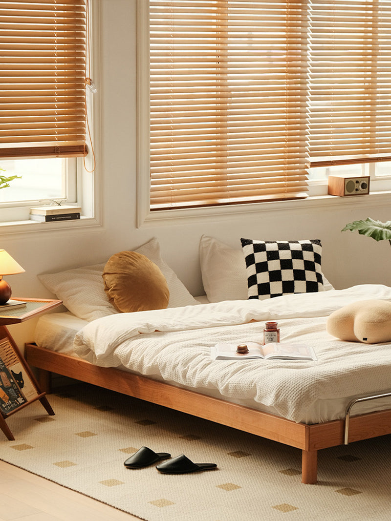 Japanese-style solid wood double bed with cherry wood platform frame.
