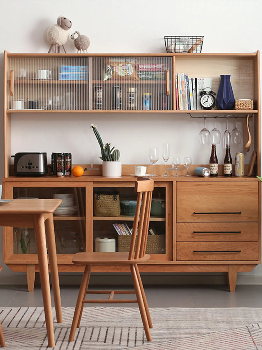 チェリー無垢材サイドボード|北欧・和モダン キッチン用ハイキャビネット ガラス扉 収納/カップボード